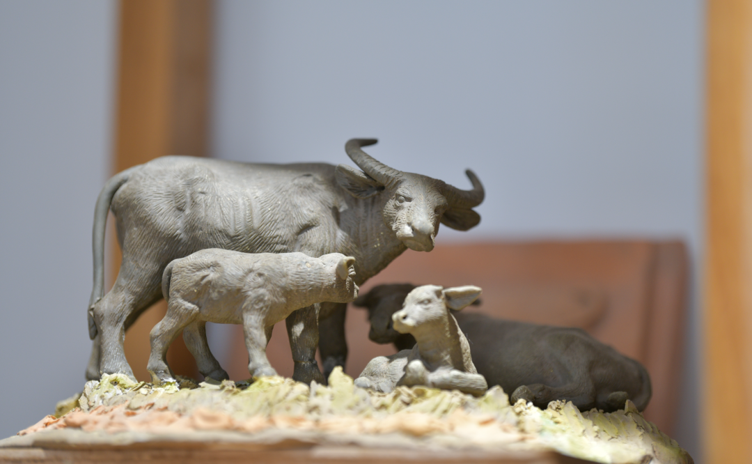 黄泽富说:“我从小拉牛踩泥巴做瓦,有时坐在牛背上看牛踩泥巴,有时趴在牛背上到处摸牛的骨头,我经常观察牛,还到外面去观察牛,它怎样卧、怎样吃草喝水,甚至杀牛时去看刮牛皮后的骨架。我没有学过解剖学,全凭自己的观察和摸索。那些美术学院的学生到我这里来,看到这些作品问我用比例尺没有,我没用比例尺,但是我做出来就是活灵活现的。”