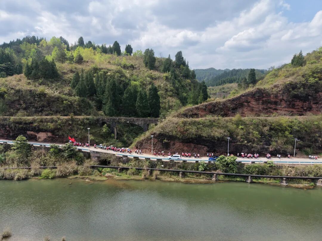中午一点,学校师生准点整队出发,途经余庆大道、乌杨田园等地,到烈士陵园祭祀后返回。行进途中,师生互帮互助、整齐前行,在亲近自然的过程中释放学业压力、收获同行快乐。