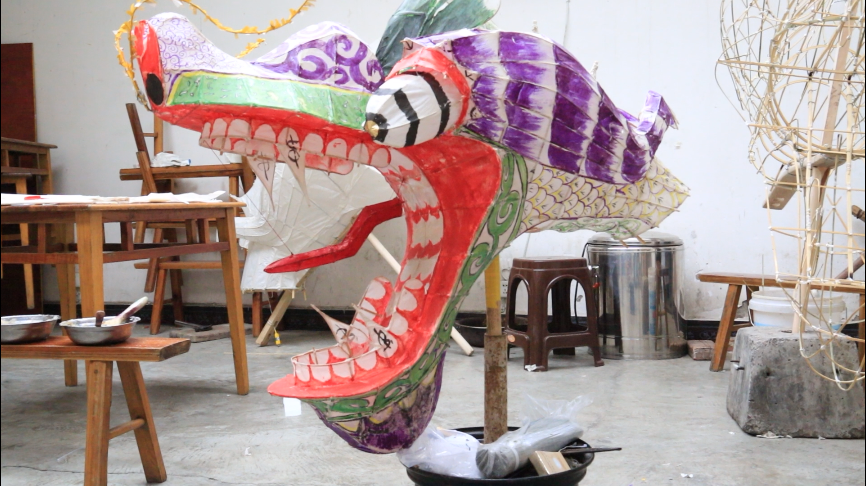 另一边,在子营派出所旁刘东家里,为了参加舞龙比赛,他正加班加点地赶制参赛队伍定制的龙灯,忙着编制龙珠、灯牌,院子里也堆着扎好的龙珠、灯牌等舞龙配套产品。手艺人彭海波家里也堆满了还未上色龙头。从劈篾子、制作骨架到糊面上色全都是彭海波一个人手工完成,每个订单都需要三天的时间来完成。