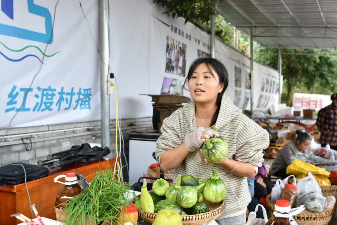 在红渡村红一广场的直播间里,主播“咔咔菲”正热情地向网友展示当地农特产品。她身后,村民们的背篼整齐排列,刚采摘的辣椒、茄子、柚子等生鲜瓜果,手工制作的糟辣椒、泡葱果、干腌菜等“土味好物”琳琅满目,直播间成了最鲜活的“田间市集”。